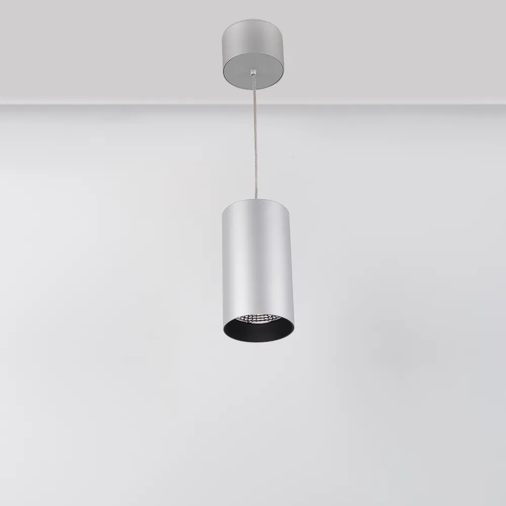 Подвесной светильник 15Вт, серебристый круглый корпус, черная вставка, металл. Цвет ДНЕВНОЙ БЕЛЫЙ 4000K, св.поток 1100лм, CRI(Ra)>80, угол 40°. Размер Ø85x155мм. Встроенный драйвер PRI:220-240VAC, SEC:DC 500mA 23-36V 15Вт.