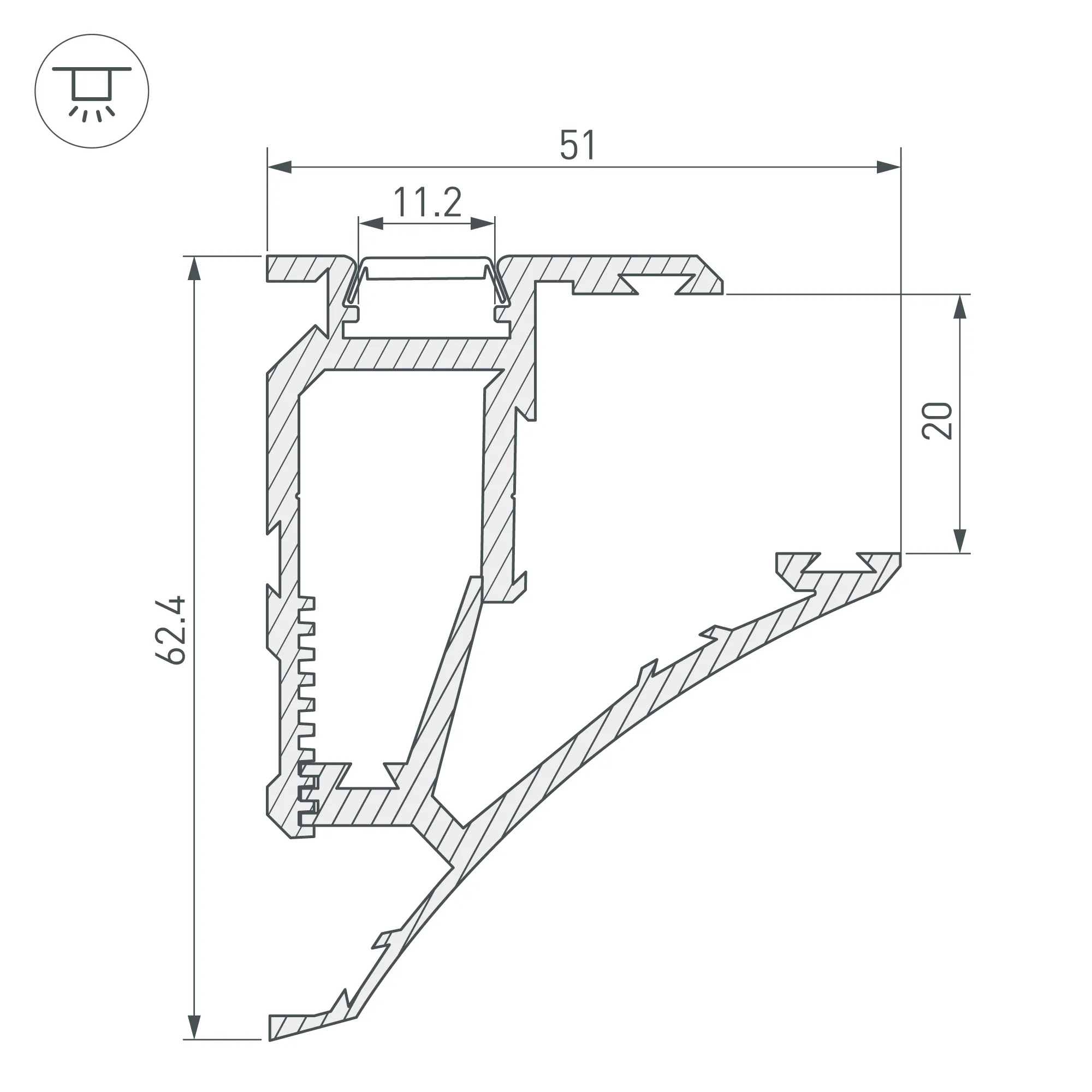 Алюминиевый анодированный профиль для монтажа и подсветки полок из стекла, пластика, дерева толщиной от 6 мм до 20 мм. Максимальная ширина полки 25 см. Максимально допустимый вес: 5 кг на каждые 30 см длины. Свечение в двух направлениях: подсветка стекла, подсветка прилегающей стены (наверх). Габаритные размеры (L×W×H): 2000x51x62,4 мм. Ширина площадки для ленты 11,2 мм. Заглушки и другие аксессуары приобретаются отдельно. Цена за 1 метр.
