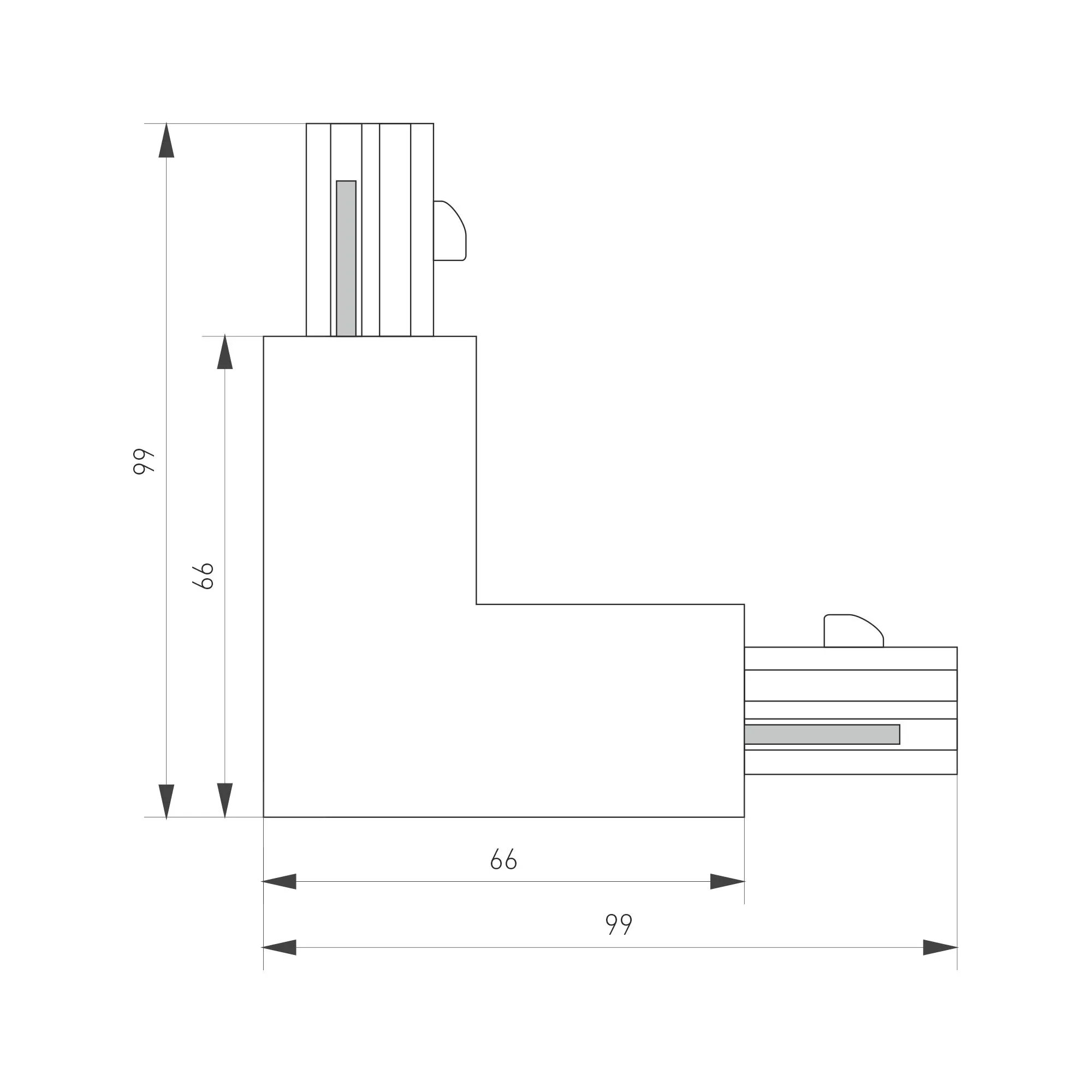 Угловой коннектор 90 градусов, питание по внешней стороне (определение необходимого коннектора происходит относительно контакта заземления системы). Цвет белый. 99х99х33 мм с контактами, 66х66х33 мм без контактов. При использовании с треками и аксессуарами другой серии возможно отличие по цвету.