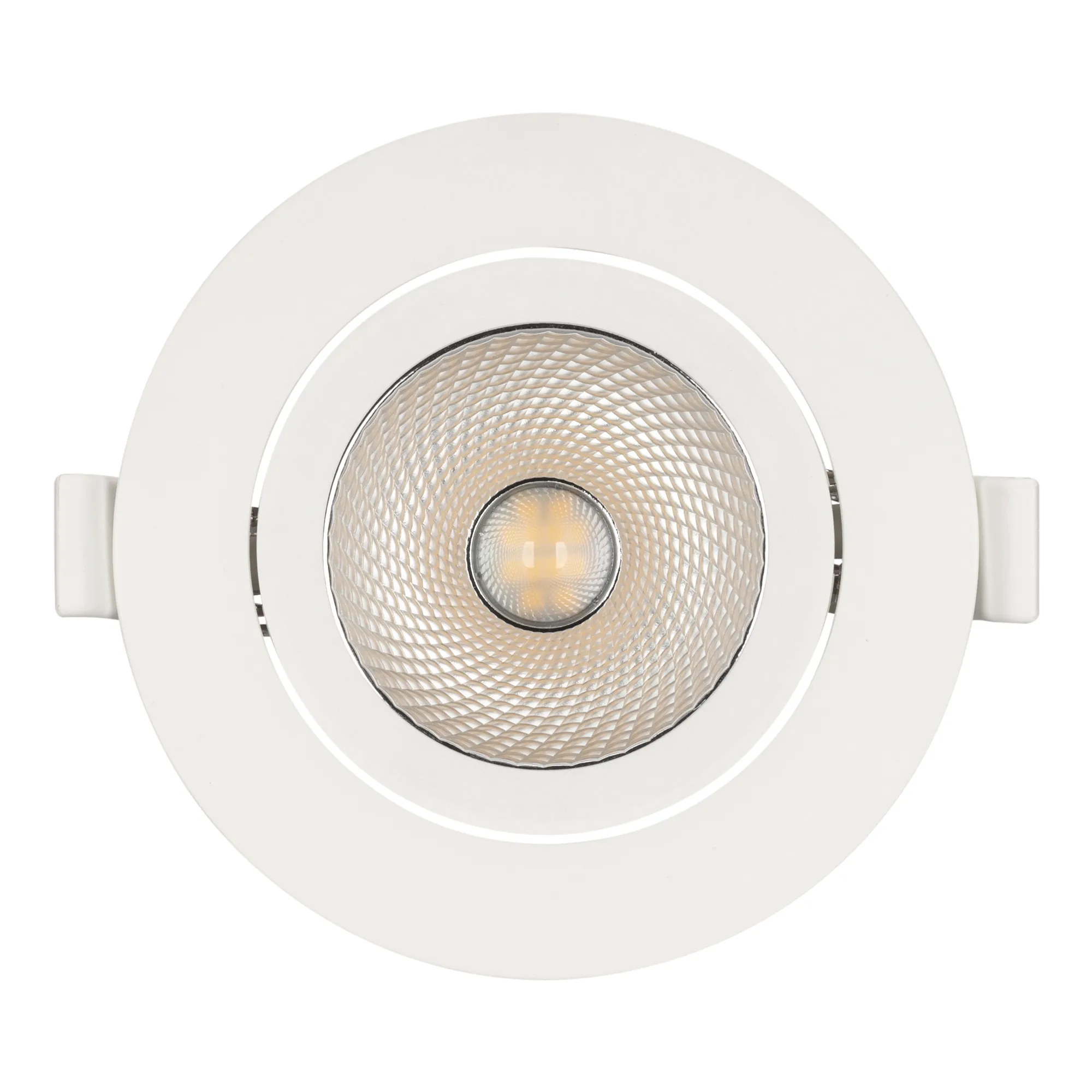 Встраиваемый поворотный светильник "даунлайт". Мощность 10 Вт, св. поток 900 лм, 90 лм/Вт, дневной 4000 K, CRI>80, UGR<19, угол 36°, напряжение питания 230 В. Белый круглый корпус из теплопроводящего полиамида, степень защиты IP20, угол поворота оси 30°. Размер: диаметр 105 мм, высота 51.5 мм. Монтаж встраиваемый, установочное отверстие диаметр 83-95 мм. Пульсация <2%.