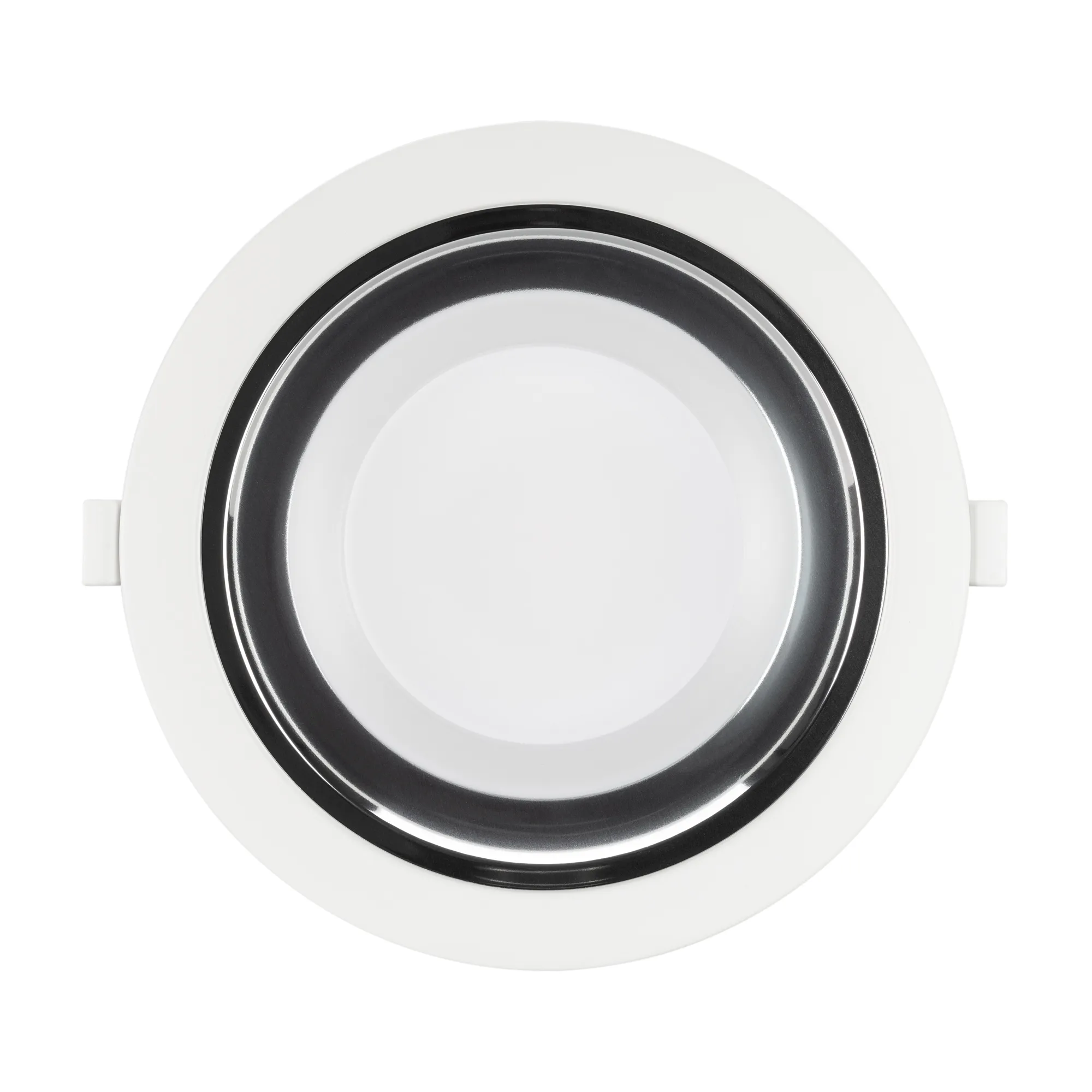 Светильник даунлайт с изменяемой цветовой температурой и переключателем на корпусе. Мощность 20 Вт, св. поток 2439-2517 лм, 100 лм/Вт, белый 6000К, или дневной 4000К, или теплый 3000К (выбор цвета свечения при установке, фиксированный), CRI>80, угол 80°, напряжение питания 230 В. Белый круглый корпус из алюминия, степень защиты IP20. Размер: диаметр 174 мм, высота 72 мм. Монтаж встраиваемый, установочное отверстие: диаметр 145-155 мм. Драйвер 18-30 В, 700 мА, пульсация <0,7%.