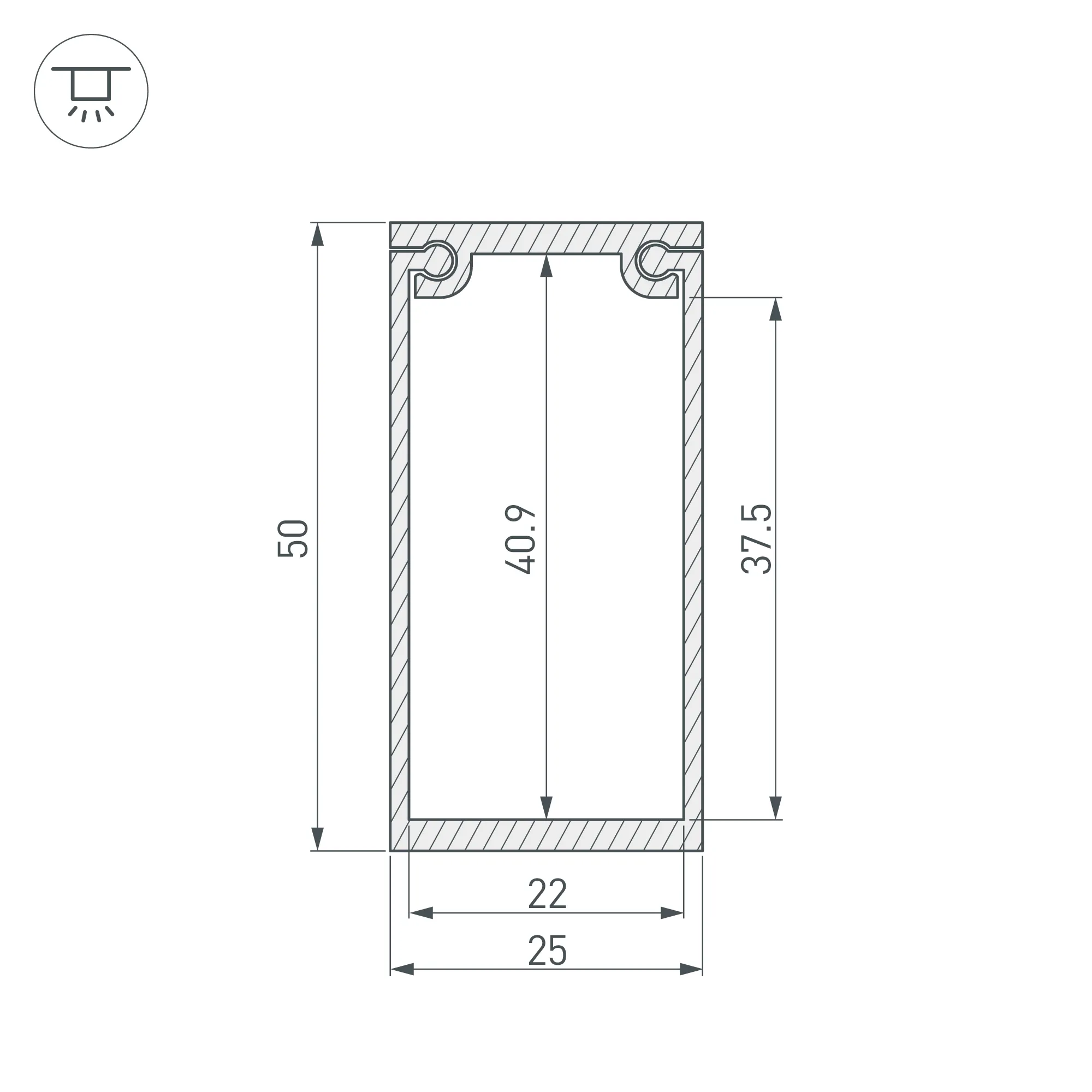 Внутренние размеры: 567×22×37,5 мм. Внешние размеры: 570×25×50мм.