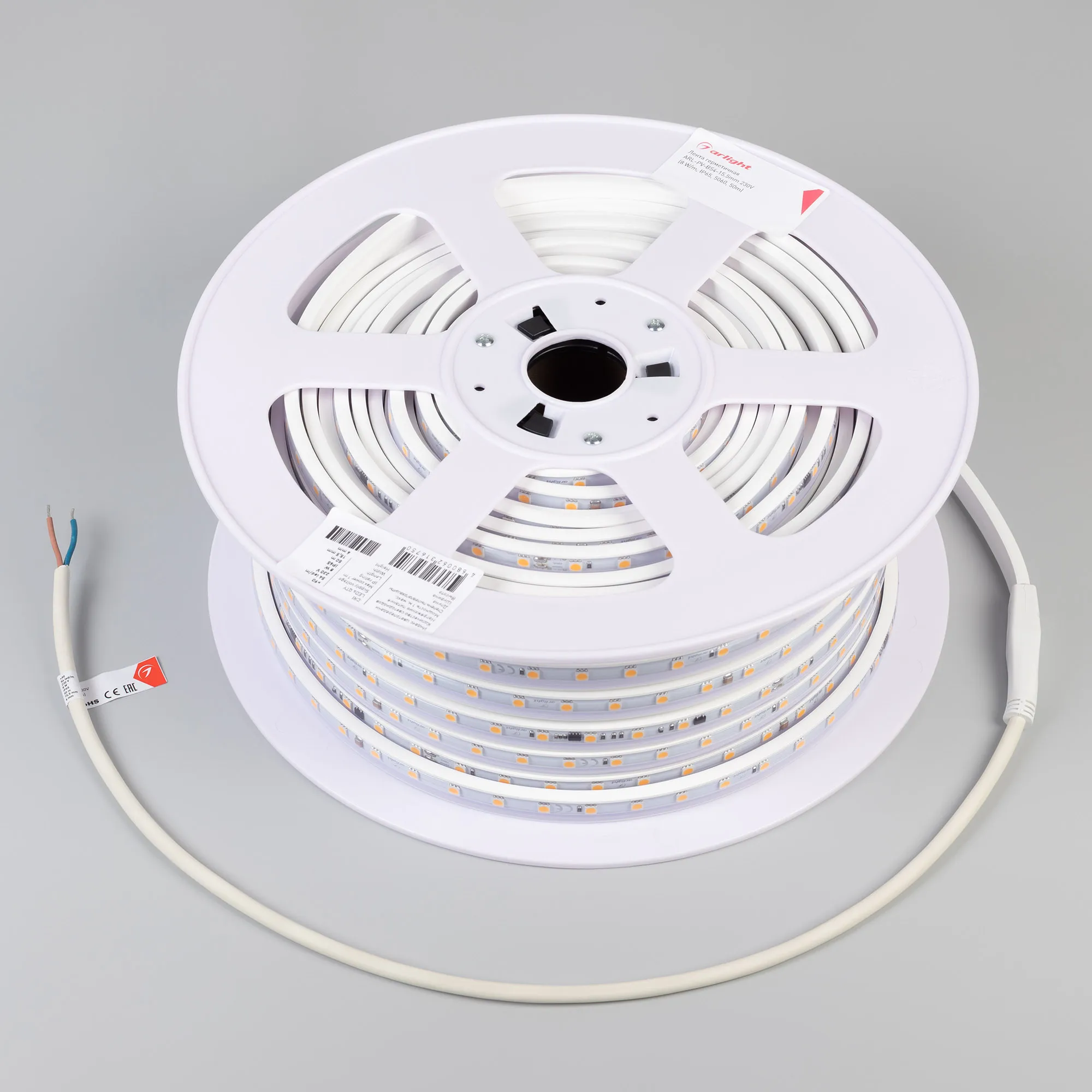 Светодиодная герметичная лента ARL серии B54, IP65 (PV - трубка, ПВХ экструзия). Светодиоды 5060, 54 шт/м, белая плата шириной 12 мм. Цвет ДНЕВНОЙ 4000K, индекс цветопередачи CRI>90, угол 120°. Питание 230 В, мощность 8 Вт/м (80 Вт на 10 м). Размеры 50000x15.5x6 мм. Мин. отрезок 500 мм, 27 светодиодов. Цена за 1 м. Светодиодная лента крепится с помощью скоб (приобретаются отдельно), 3M скотч отсутствует. Катушка 50 м.