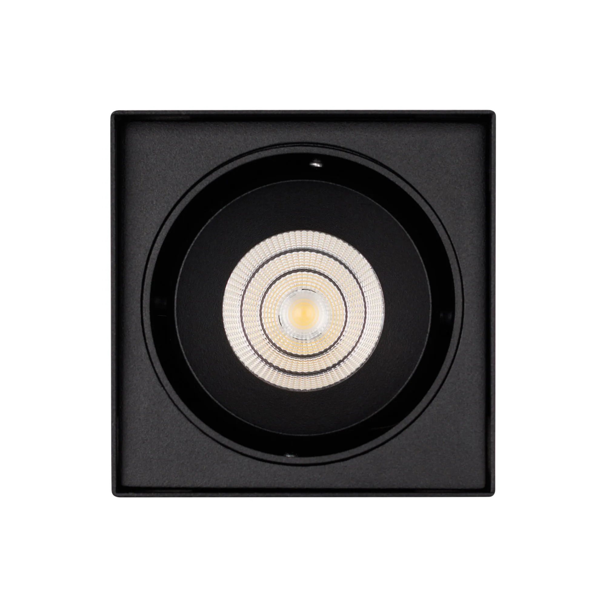 Накладной интерьерный светильник. Мощность 11 Вт, св. поток 830 лм, 75 лм/Вт, теплый 3000 K, CRI>90, угол 40°, регулируемое направление луча 30°, напряжение питания 230 В. Черный квадратный корпус из алюминия, степень защиты IP20. Размер: длина 100 мм, ширина 100 мм, высота 135 мм. Монтаж накладной. Драйвер 18-24 В, 500 мА, пульсация <5%.