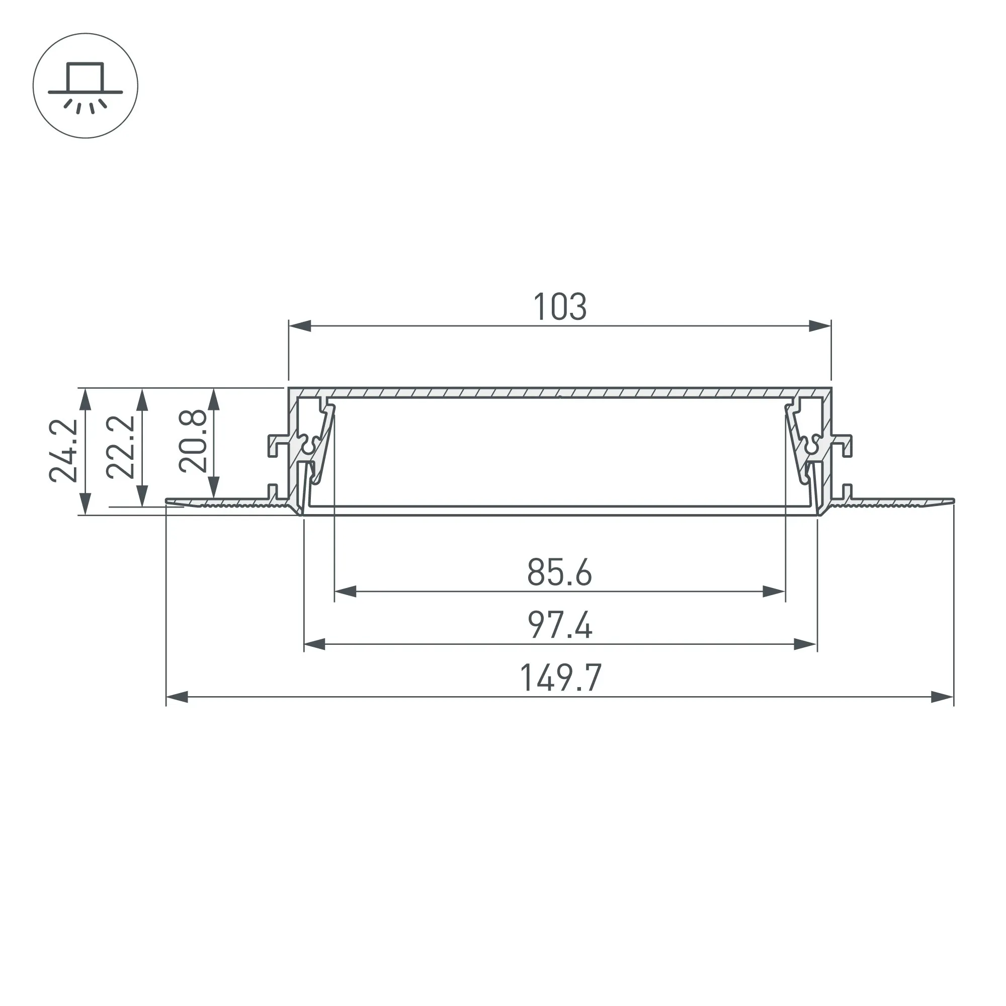 Алюминиевый анодированный профиль для светодиодных лент и линеек. Скрытая установка (под строительную отделку). Габаритные размеры (L×W×H): 2000x149,7x24,2 мм. Ширина площадки для ленты 85,6 мм. Экраны, заглушки и другие аксессуары приобретаются отдельно. Цена за 1 метр.