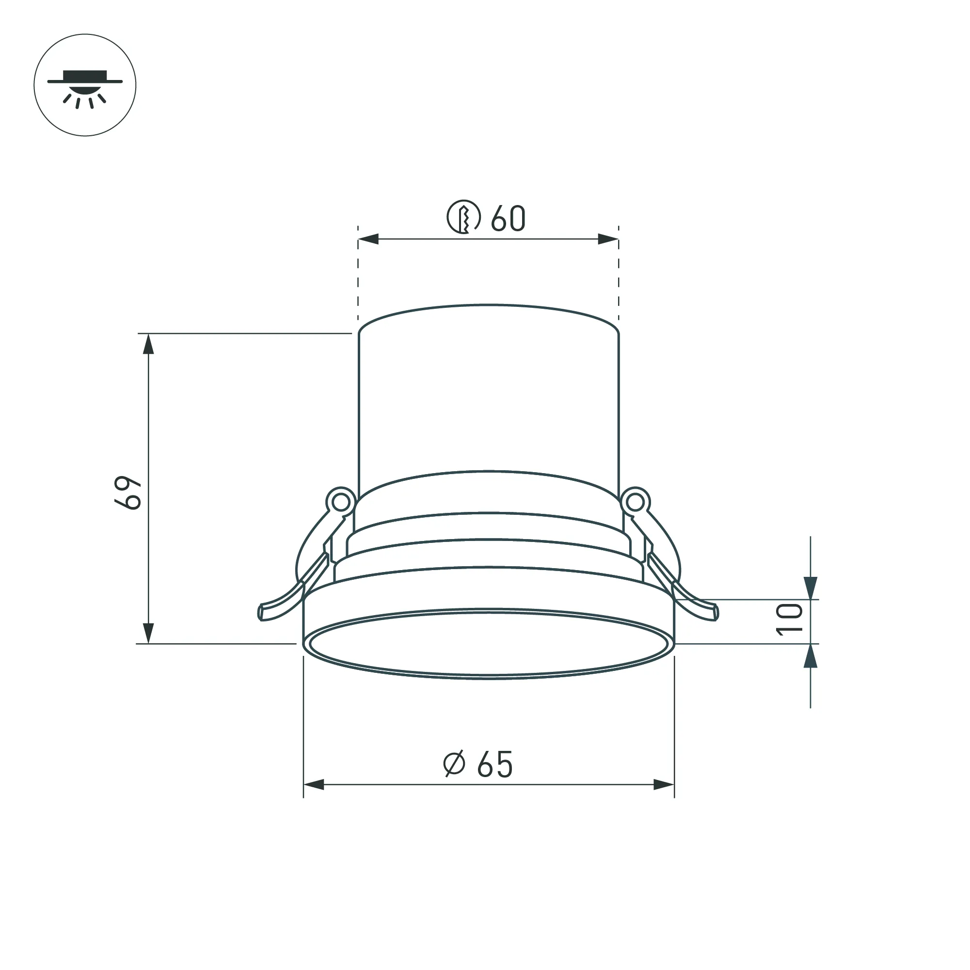 Встраиваемый светильник даунлайт. Мощность 6 Вт, св. поток 560 лм, 93 лм/Вт, дневной 4000 K, CRI>90, UGR<16, угол 38°, напряжение питания 230 В. Белый круглый корпус из алюминия, степень защиты IP20. Размер: диаметр 65 мм, высота 69 мм. Монтаж встраиваемый, установочное отверстие: диаметр 60 мм. Драйвер 28-42 В, 150 мА, пульсация <2%.