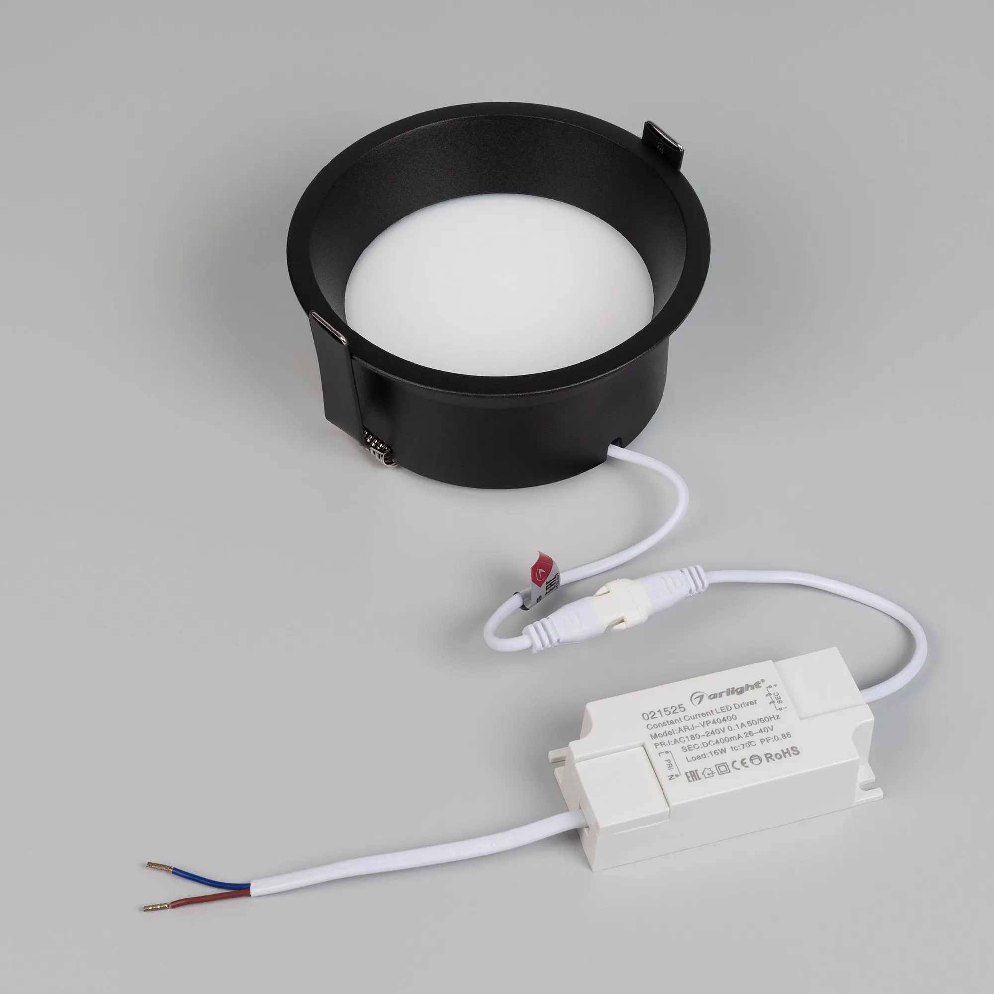 Встраиваемый светильник даунлайт. Мощность 16 Вт, св. поток 960 лм, 60 лм/Вт, дневной 4000 K, CRI>90, угол 85°, напряжение питания 230 В. Чёрный круглый корпус из алюминия, степень защиты IP20. Размер: диаметр 125 мм, высота 60 мм. Монтаж встраиваемый, установочное отверстие: диаметр 115 мм. Драйвер 27-42 В, 400 мА, пульсация <2%.