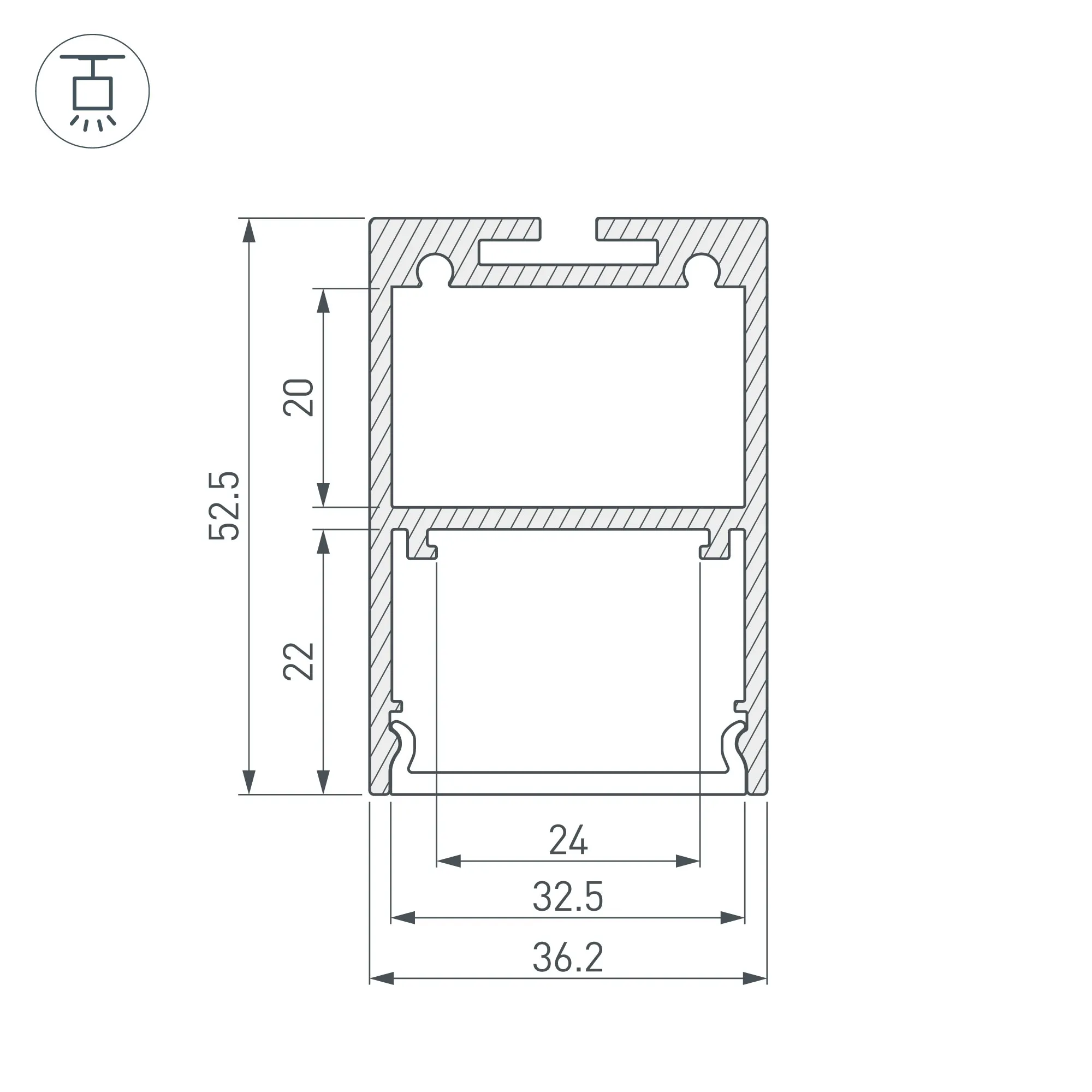 Алюминиевый анодированный подвесной профиль для светодиодных лент и линеек, с отсеком для блока питания (размер отсека 32x20 мм). Габаритные размеры (L×W×H): 3000x36,2x52,5 мм. Ширина площадки для ленты 24 мм. Экраны, заглушки и другие аксессуары приобретаются отдельно. Цена за 1 метр.