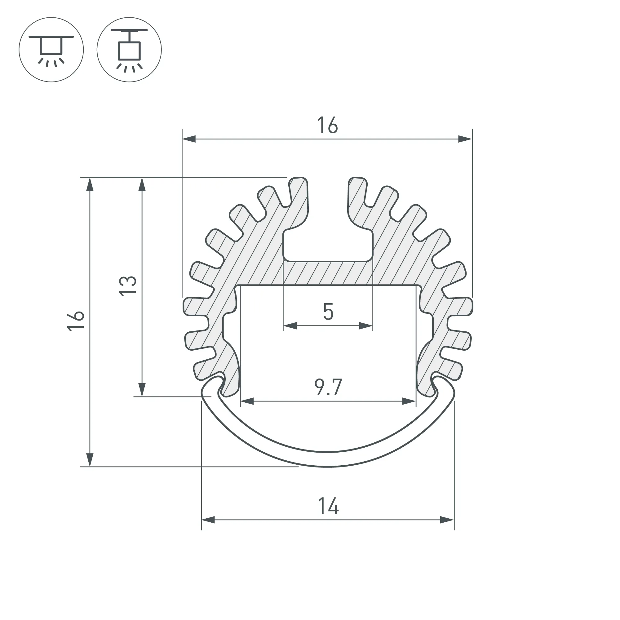 Алюминиевый анодированный круглый профиль для светодиодных лент и линеек. Габаритные размеры профиля (L×W×H): 2000x16x13 мм. Габаритные размеры профиля с экраном (L×D): 2000xD16 мм. Ширина площадки для ленты 9,7 мм. Экраны, заглушки и другие аксессуары приобретаются отдельно. Цена за 1 метр.