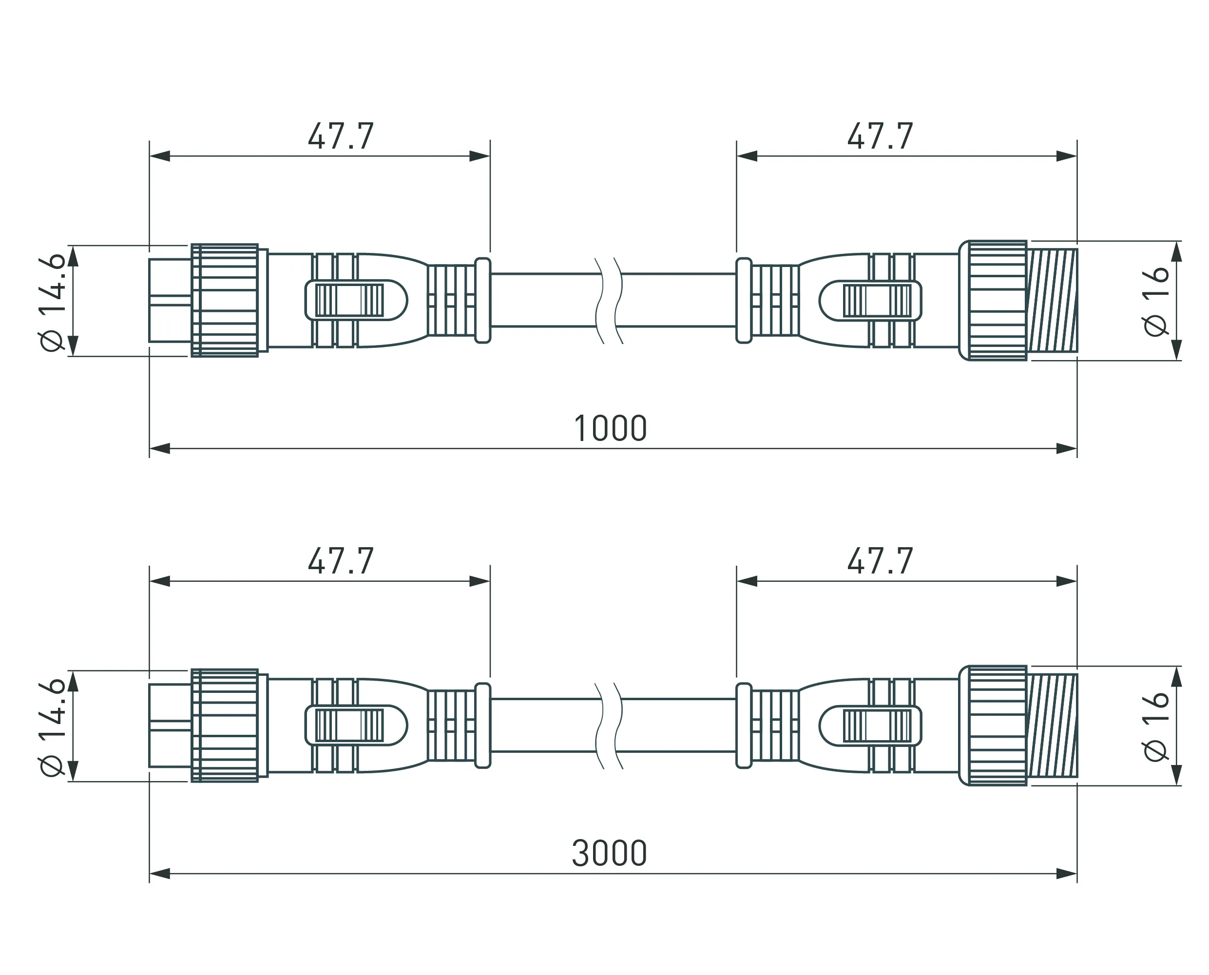 Водонепроницаемый IP67 прямой коннектор для электрического соединения светильников серии LINE. Длина 1000мм, сечение 3x1.0мм2 Один конец - male коннектор 3 pins, другой конец- female коннектор 3 pins. Габариты разъёмов DxH - Ø18х48мм.