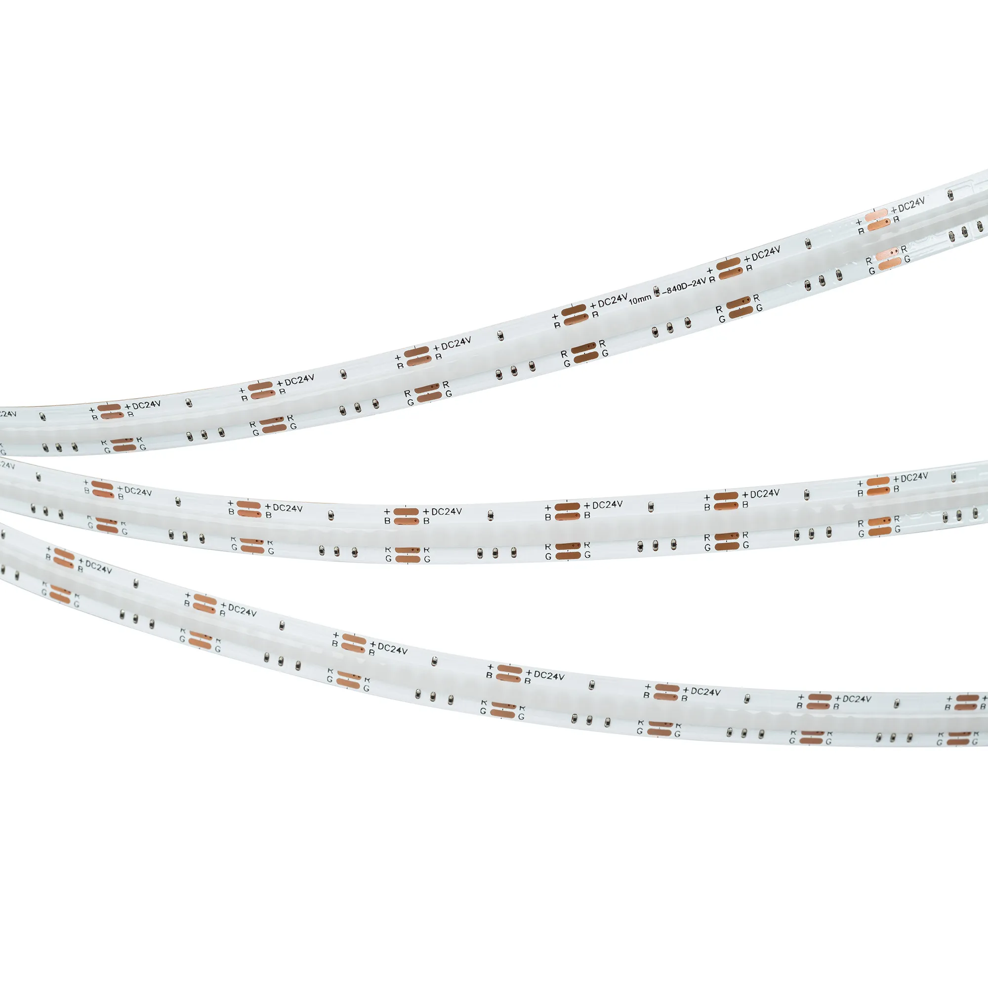 Мультицветная светодиодная лента сплошного свечения COB серии X840. Светодиоды CSP, 840 шт/м, белая плата шириной 10 мм, скотч 3M. Цвет RGB, угол 160°. Питание 24 В, мощность 16 Вт/м (80 Вт на 5 м). Размеры 5000x10x1.5 мм. Мин. отрезок 25 мм. Цена за 1 м. Обязательна установка на профиль.