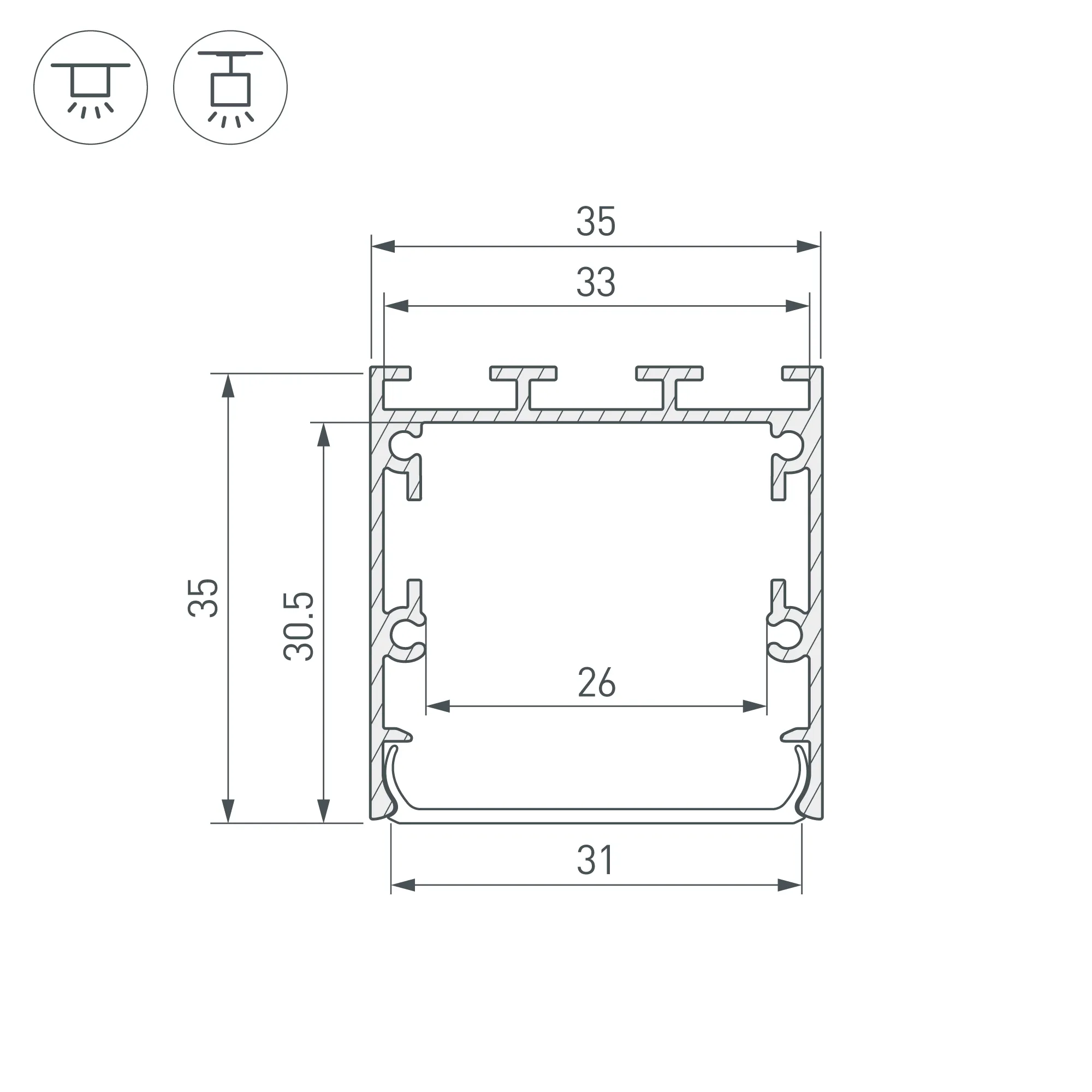 Алюминиевый профиль для светодиодных лент и линеек. Цвет - черный RAL9005 (порошковая окраска). Габаритные размеры (L×W×H): 3000x35x35,5 мм. Ширина площадки для ленты 26 мм. Экраны, заглушки и другие аксессуары приобретаются отдельно. Цена за 1 метр.