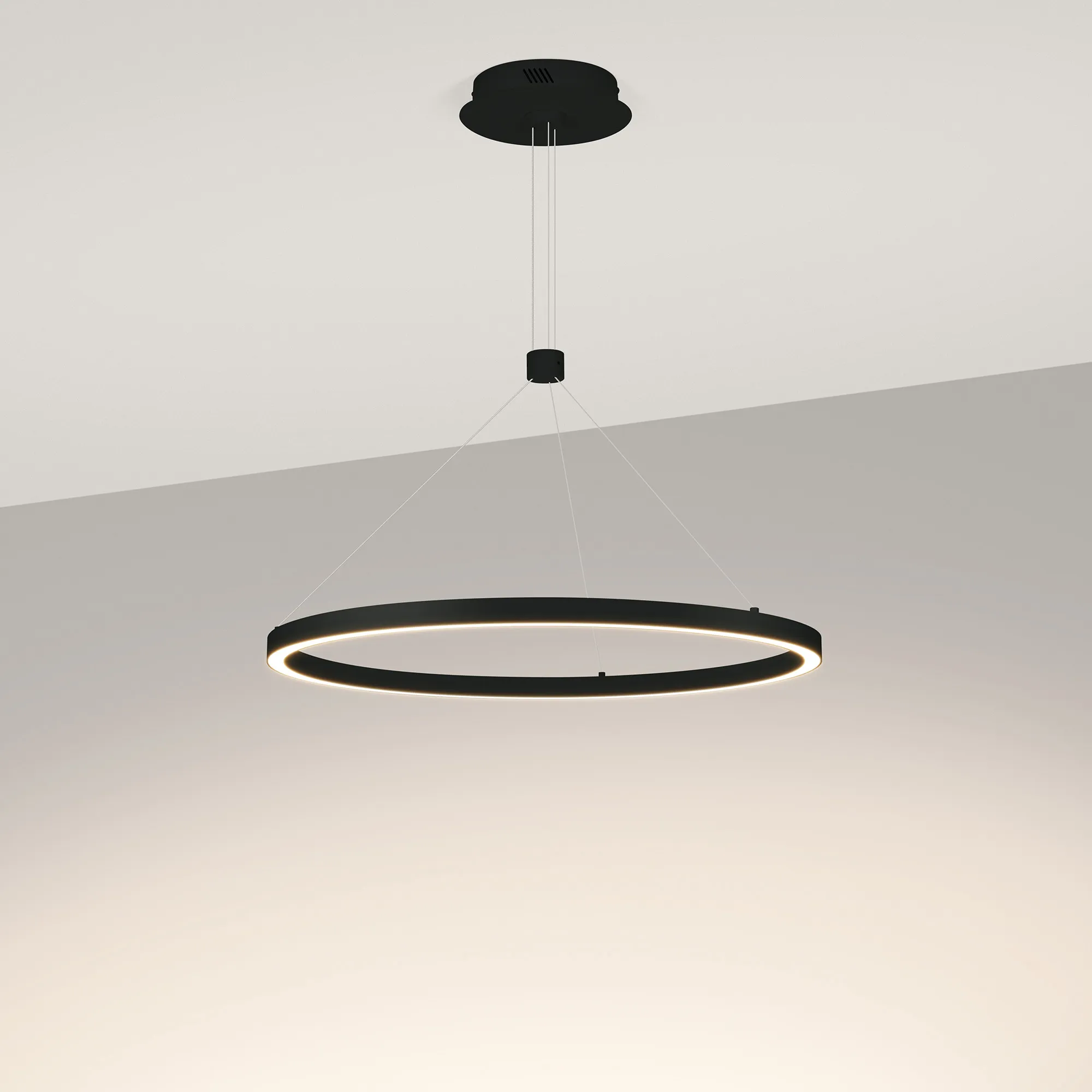 Подвесной светильник. Мощность 36 Вт, св. поток 2050 лм, 57 лм/Вт, дневной 4000 K, CRI>90, угол 120°, напряжение питания 230 В. Черный круглый корпус из алюминия, экран силикон, степень защиты IP20. Размер: диаметр 600 мм, высота 25 мм, ширина профиля 25 мм, размер чаши: диаметр 170 мм, высота 40 мм. Монтаж подвесной, длина подвеса 1200мм. Драйвер 33-40 В, 900 мА. Пульсация <5%.