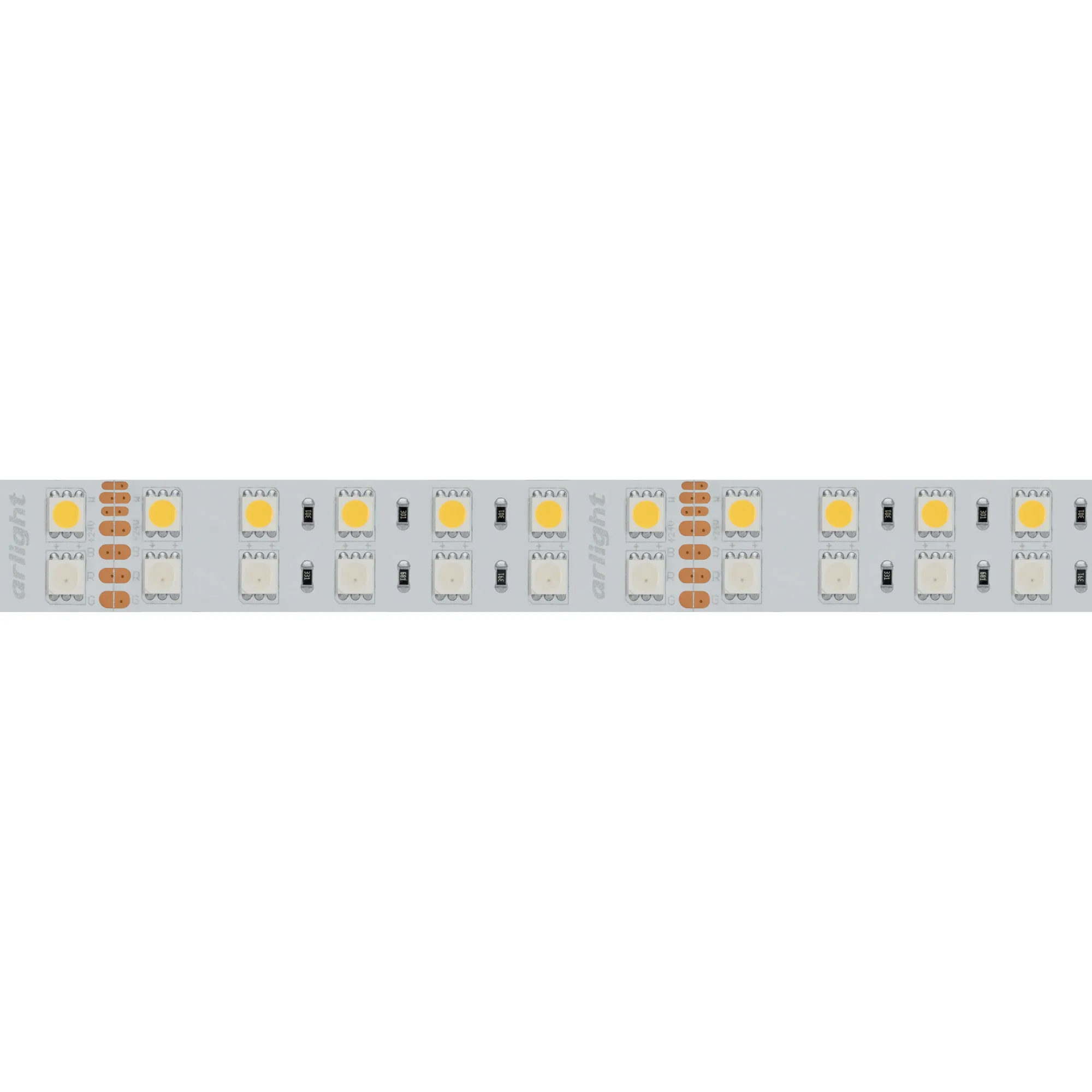 RGB+Day мультицветная лента, 2 ряда светодиодов smd 5060, 144шт/м (720шт на 5м), белая плата 19мм, скотч 3М. Цвет Мультицвет R/G/B+Дневной 4000K. Питание 24V, мощность 160 Вт на 5м, из них R/G/B=16 Вт/м (5.3 Вт/м канал), белый W=16 Вт/м, угол 120°. Размеры 5000х19х2.2мм. Мин.отрезок 83.3мм, 12 светодиодов. Цена за 1м.