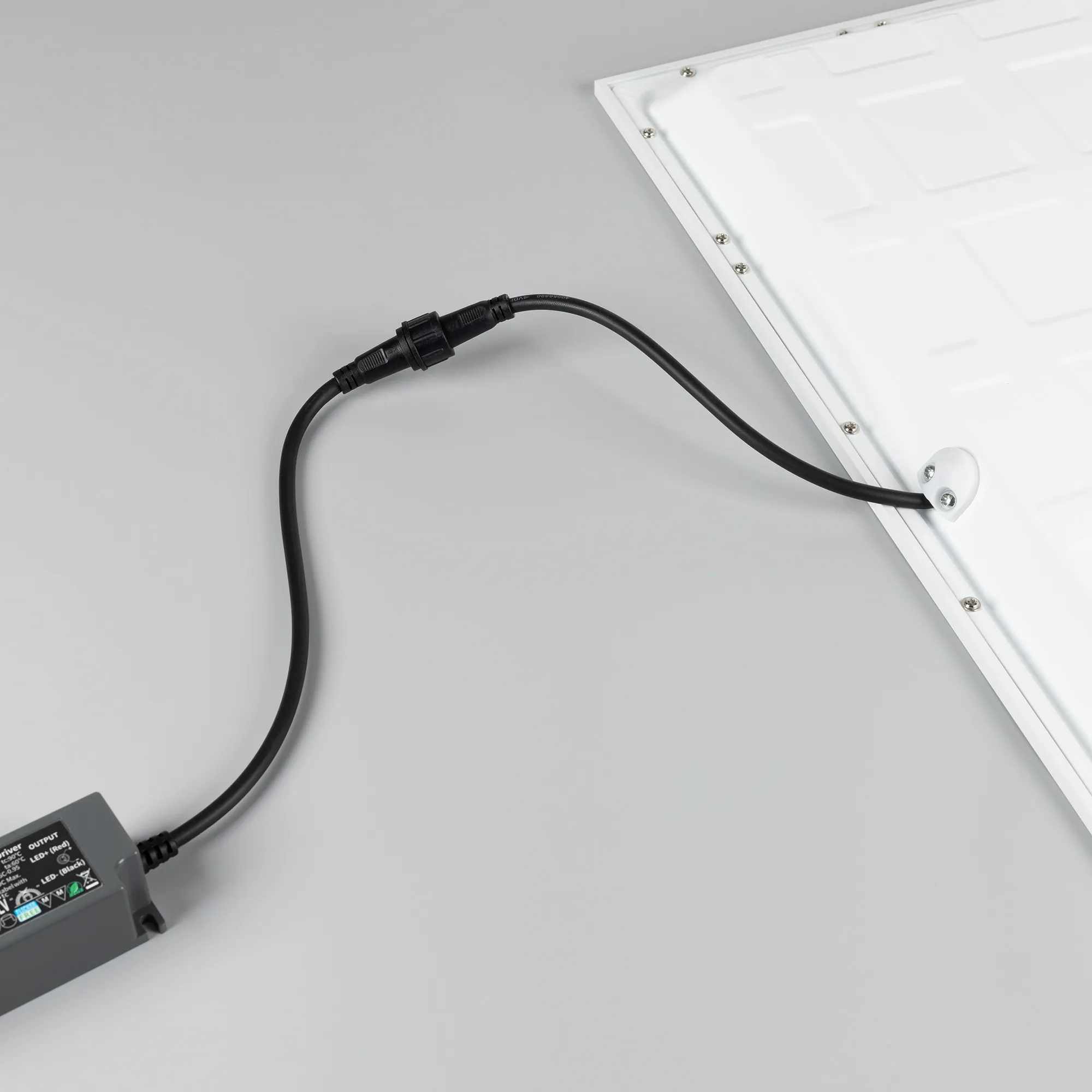Светодиодная панель с прямой засветкой (backlit). Мощность 40 Вт, св. поток 4000 лм, 100 лм/Вт, белый 6000-6500 K, CRI>90, угол 120°, напряжение питания 230 В. Белый квадратный корпус из алюминия, экран PS, степень защиты IP54. Размер: длина 595 мм, ширина 595 мм, высота 31,3 мм. Монтаж встраиваемый, установочное отверстие длина 575 мм, ширина 575 мм. Драйвер 28-42 В, 1000 мА, пульсация <1% со степенью защиты IP65, подключение с помощью герметичного коннектора.