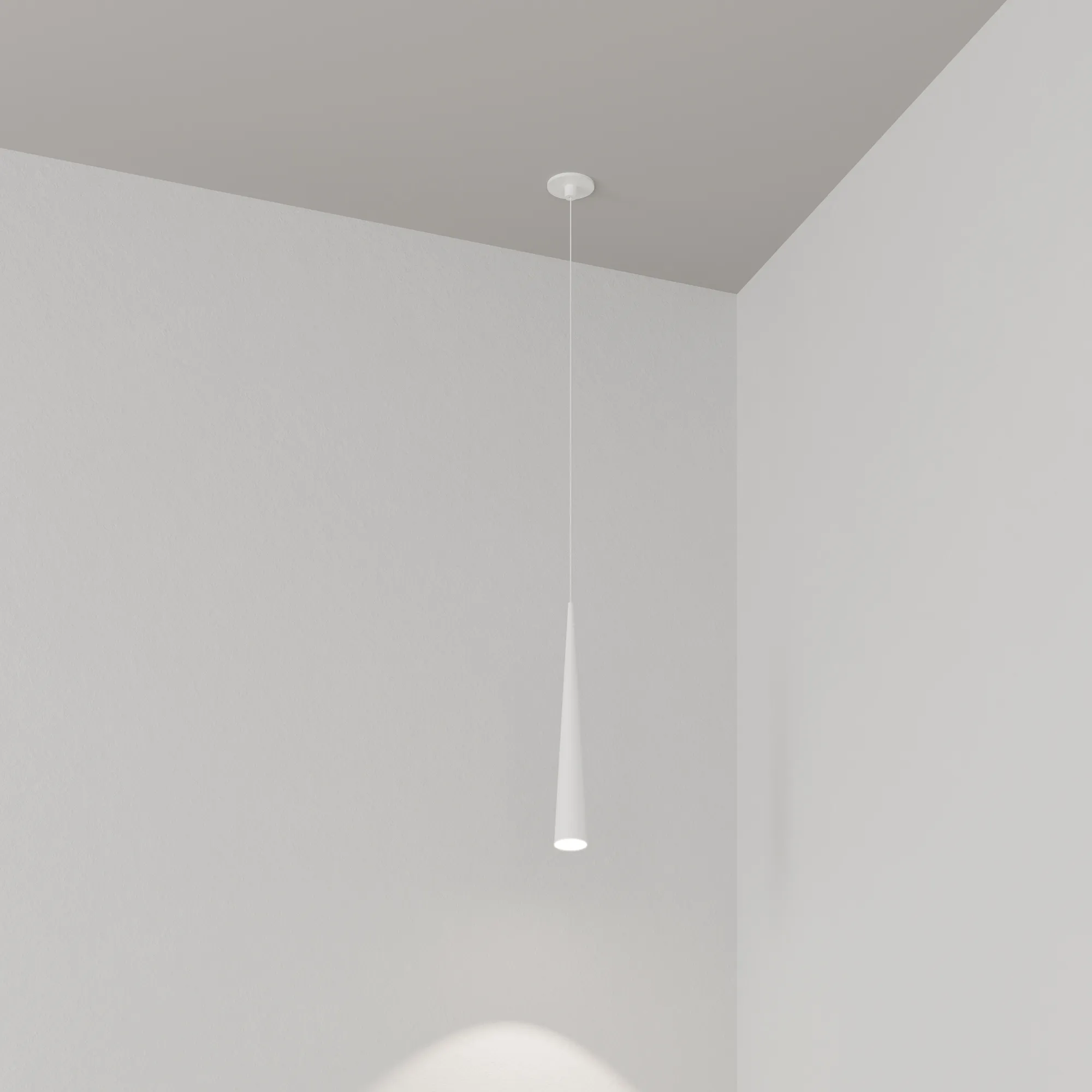 Подвесной светильник. Мощность 5 Вт, св. поток 400 лм, световая эффективность 70 лм/Вт, теплый 2700 K, CRI>92, угол 36°, напряжение питания 230 В. Белый конусообразный вытянутый корпус из алюминия, линза из PMMA, степень защиты IP20. Размер: диаметр 57 мм, высота 400 мм. Монтаж подвесной, длина подвеса 2000 мм, регулируемая. В комплекте 2 вида чаш. Габариты встраиваемой чаши: Ø 80x41 мм. Габариты накладной чаши Ø80x60 мм. Драйвер 2,8-12В, 500 мА, пульсация <1%.