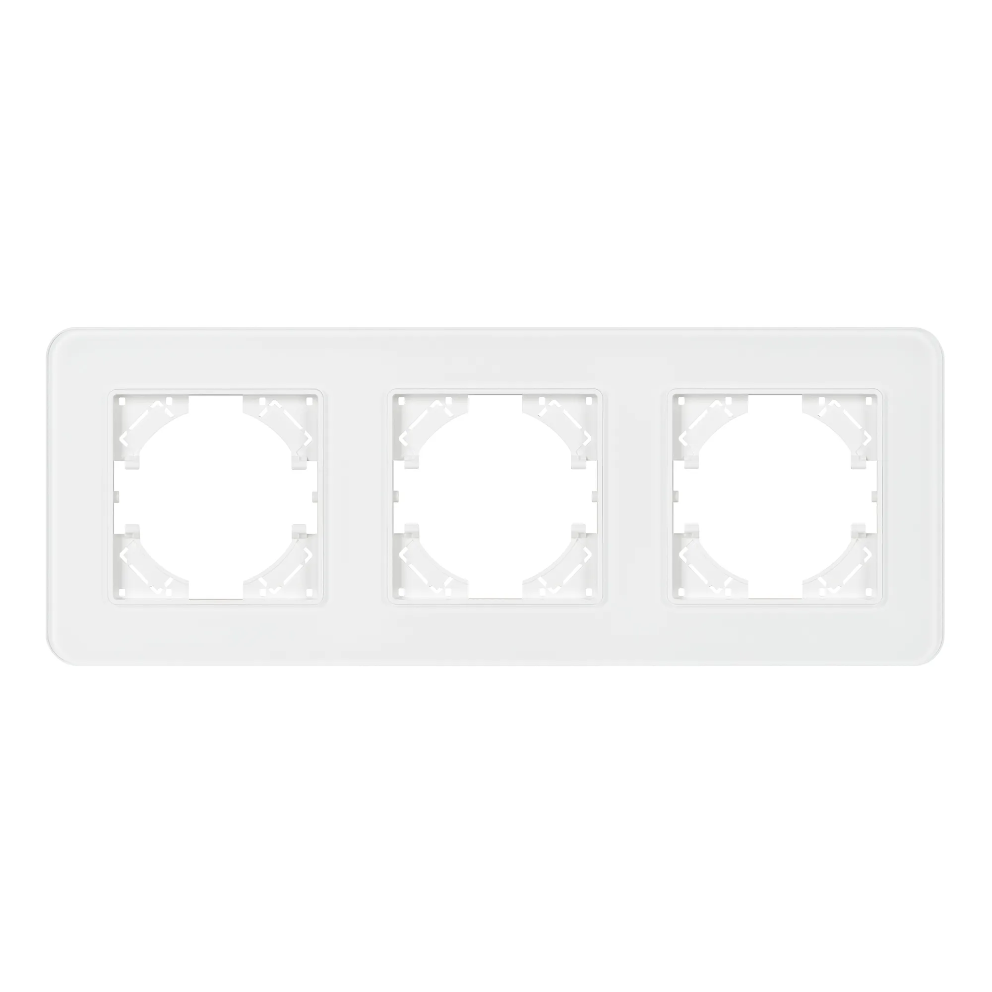 Рамка стеклянная на 3 поста, под встраиваемый механизм. Цвет - белый с Soft-Touch покрытием. Уровень герметичности IP20. Ориентация монтажа - горизонтальная (основным ориентиром служат посадочные выступы для накладки механизма).