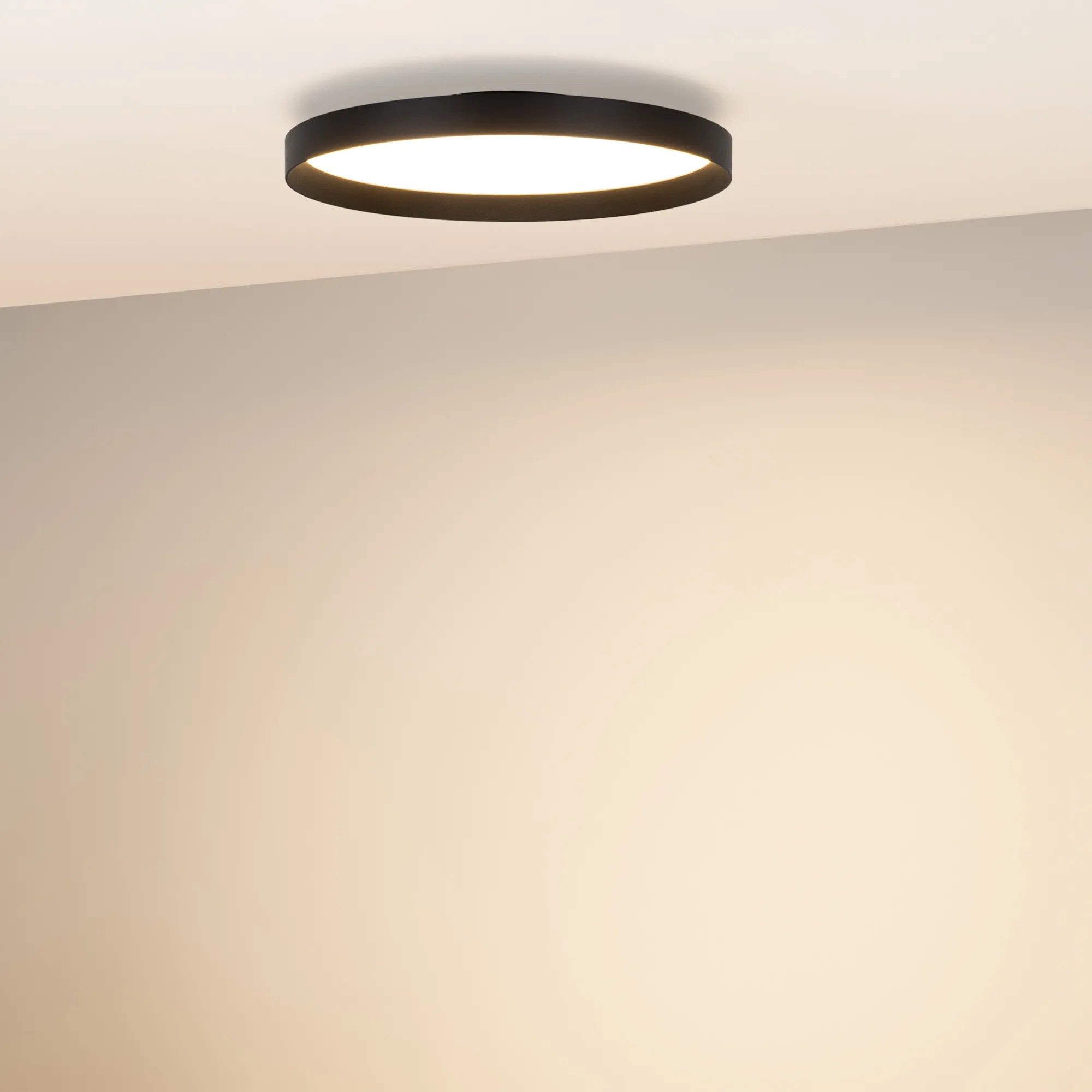 Светодиодный накладной светильник с изменяемой цветовой температурой. Мощность 40 Вт, св. поток 3018-3305 лм, 80-85 лм/Вт, теплый 2700 K, теплый 3300 K, дневной 4000K (переключается), CRI>92, угол 80°, напряжение питания 230 В. Черный круглый корпус из алюминия, матовый призматический экран PC, степень защиты IP20. Размер: Ø 450х70 мм. Размер световой части: Ø 450х39 мм, размер основания: Ø 196х31мм. Монтаж накладной. Драйвер 9-38 В, 1050 мА, пульсация <0,3%. Диммирование TRIAC.