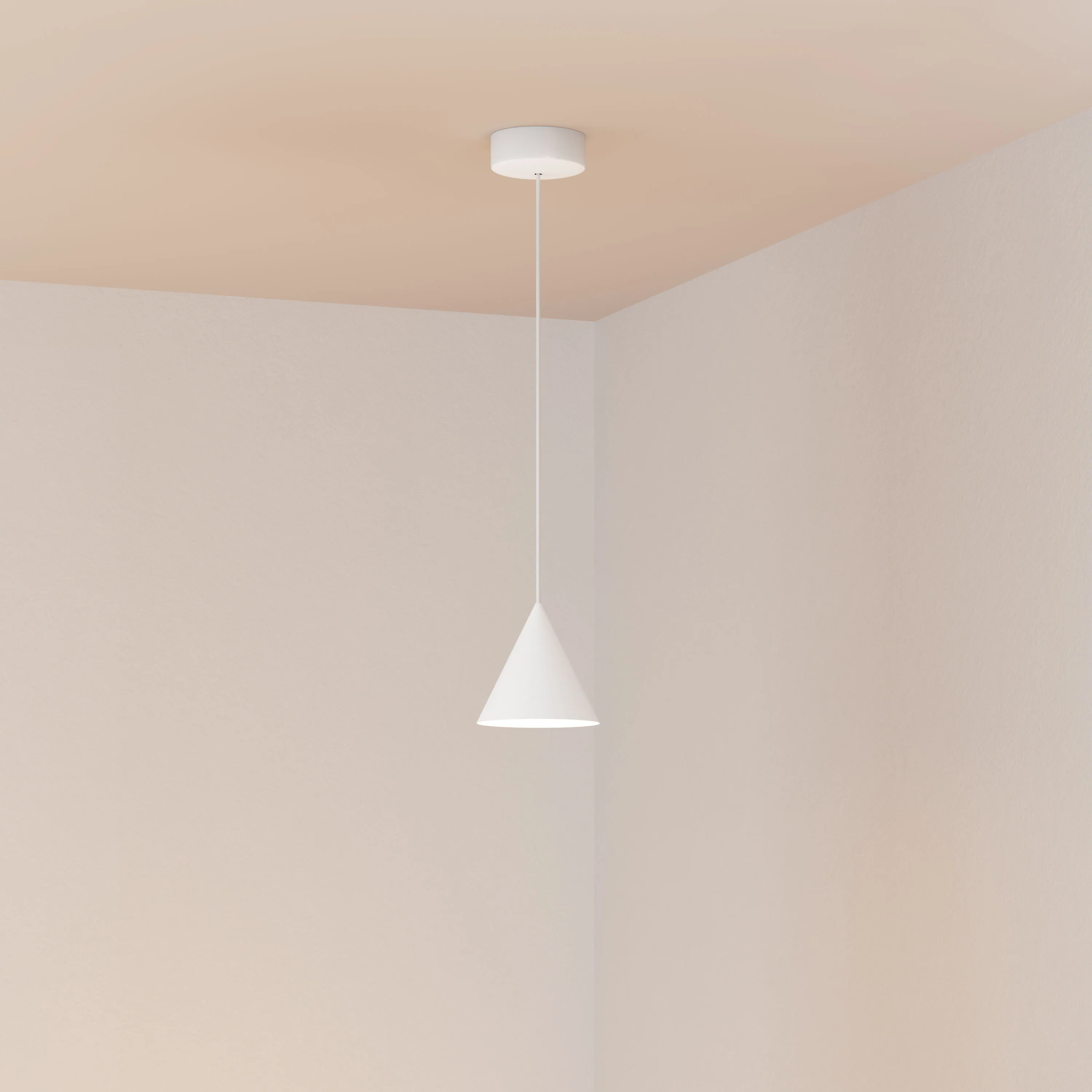 Подвесной светильник. Мощность 10 Вт, св. поток 650 лм, 65 лм/Вт, теплый 3000 K, CRI>94, угол 36°, напряжение питания 230 В. Белый корпус из алюминия в форме конуса с белой внутренней поверхностью, линза-рассеиватель из PMMA, степень защиты IP20. Размер: диаметр 180 мм, высота 175 мм. Монтаж подвесной, длина подвеса 2000 мм, регулируемая. В комплекте две чаши. Габариты чаши (встроенной) Ø80 х 41 мм, врезное отверстие Ø55 мм, габариты чаши (накладной) Ø110 х 25 мм. Драйвер 2,8-12В, 500 мА, пульсация <1%. Управление по TRIAC.