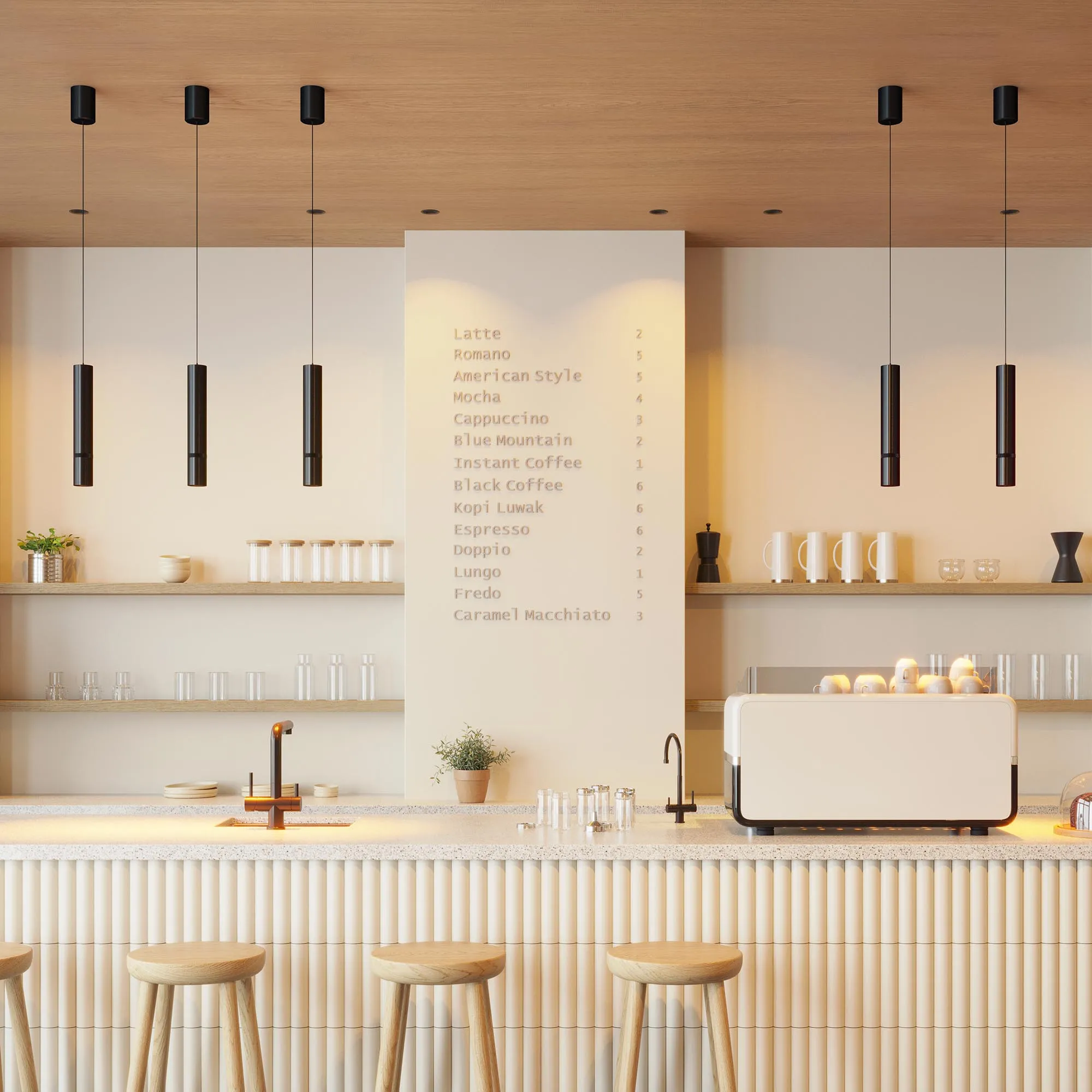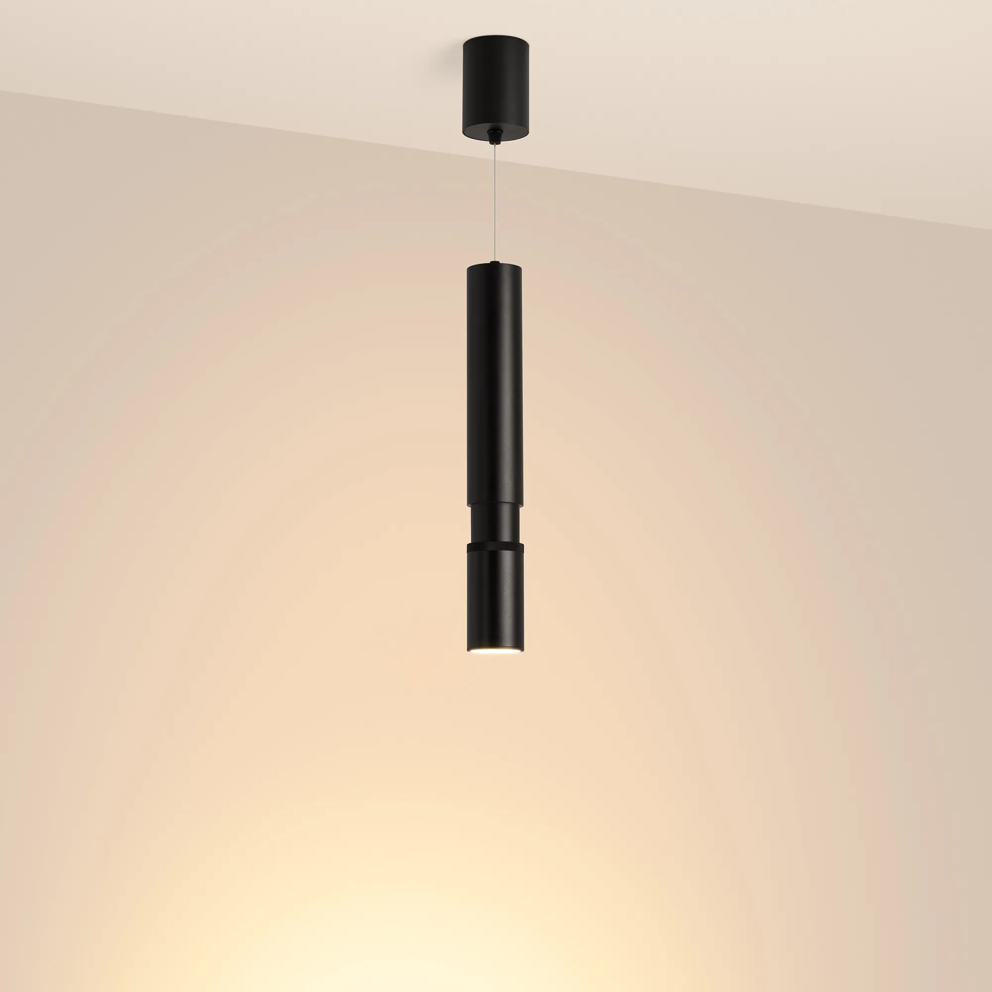 Декоративный подвесной светильник, 15Вт. Изменяемый цвет свечения 2700K/ 3300K/4000K (переключается), световой поток 288-1240 лм, 20-80 лм/Вт, регулируемый угол 8-80°, CRI>90. Корпус круглый, металл, цвет черный, IP20. Размеры светового модуля: DxH Ø60x370(430) мм, подвес регулируемый, макс. длина 1550 мм. Размер чаши Ø75x100 мм. Входное напряжение AC220-240V, мощность 15Вт. Драйвер встроенный 25-40V, 300 мА. Пульсация <1 %. Диммирование по TRIAC.