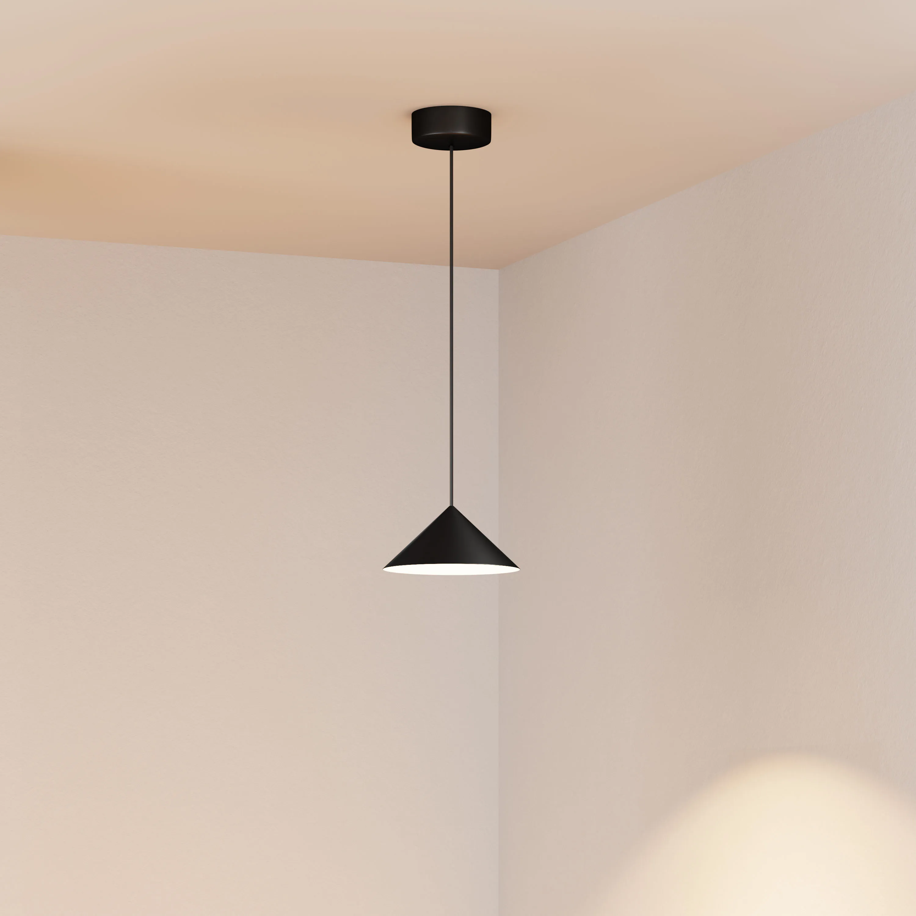 Подвесной светильник. Мощность 10 Вт, св. поток 750 лм, 75 лм/Вт, теплый 2700 K, CRI>94, угол 36°, напряжение питания 230 В. Черный корпус из алюминия в форме конуса с белой внутренней поверхностью, линза-рассеиватель из PMMA, степень защиты IP20. Размер: диаметр 240 мм, высота 110 мм. Монтаж подвесной, длина подвеса 2000 мм, регулируемая. В комплекте две чаши. Габариты чаши (встроенной) Ø80 х 41 мм, врезное отверстие Ø55 мм, габариты чаши (накладной) Ø110 х 25 мм. Драйвер 2,8-12В, 520 мА, пульсация <1%. Управление по TRIAC.