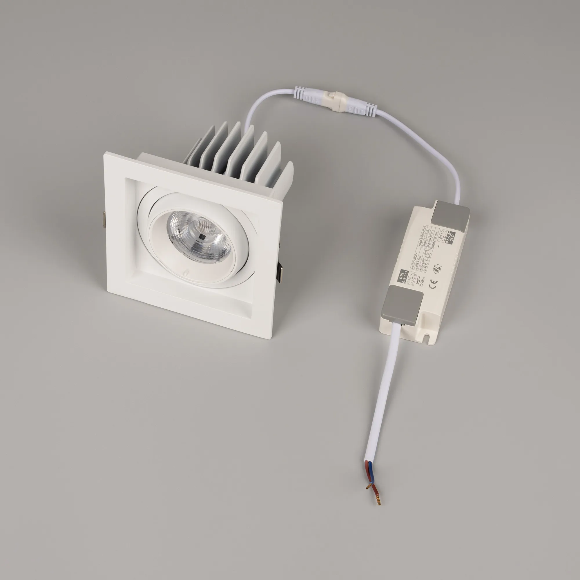 Встраиваемый карданный светильник. Мощность 20 Вт, св. поток 2132 лм, 107 лм/Вт, тёплый 3000 K, CRI>92, угол 40°, напряжение питания 230 В. Белый корпус из алюминия, белая вставка, степень защиты IP20. Размер: длина 117 мм, ширина 117 мм, высота 105 мм. Монтаж встраиваемый, установочное отверстие: длина 95 мм, ширина 95 мм. Драйвер 24-42 В, 500 мА, пульсация <2%.