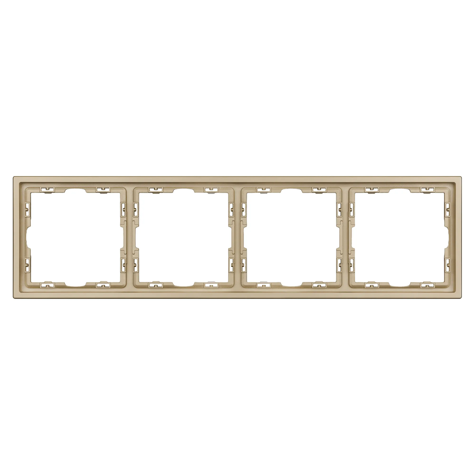 Рамка пластиковая на 4 поста, под встраиваемый механизм. Цвет - золотой песок, с Soft-Touch покрытием. Среднего уровня герметичности IP20. Ориентация монтажа горизонтальная.