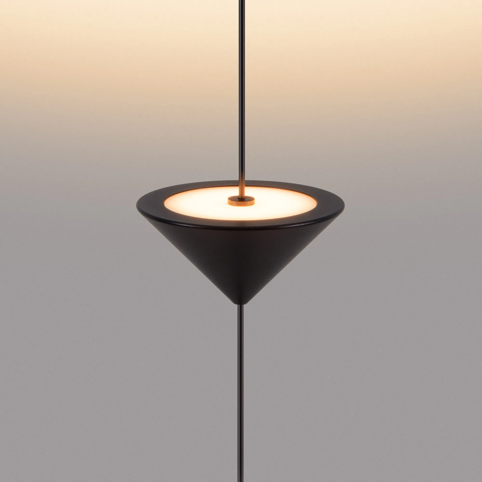 Декоративный накладной подвесной светильник. Мощность 12 Вт, св. поток 370 лм, 28 лм/Вт, теплый 2700 K, CRI>90, угол 110°, напряжение питания 230 В. Черный фигурный корпус из алюминия, экран PC, степень защиты IP20. Размер светоизлучающих модулей: Ø 100x55 мм; размер основания: Ø120*60 мм. Максимальная длина подвесной линии: 3800 мм (регулируется). Монтаж накладной, потолочная чаша: Ø60х150 мм. Драйвер 24-42 В, 300мА, пульсация<0,3. Совместим со встраиваемыми чашами 046018, 046020 (приобретаются отдельно).