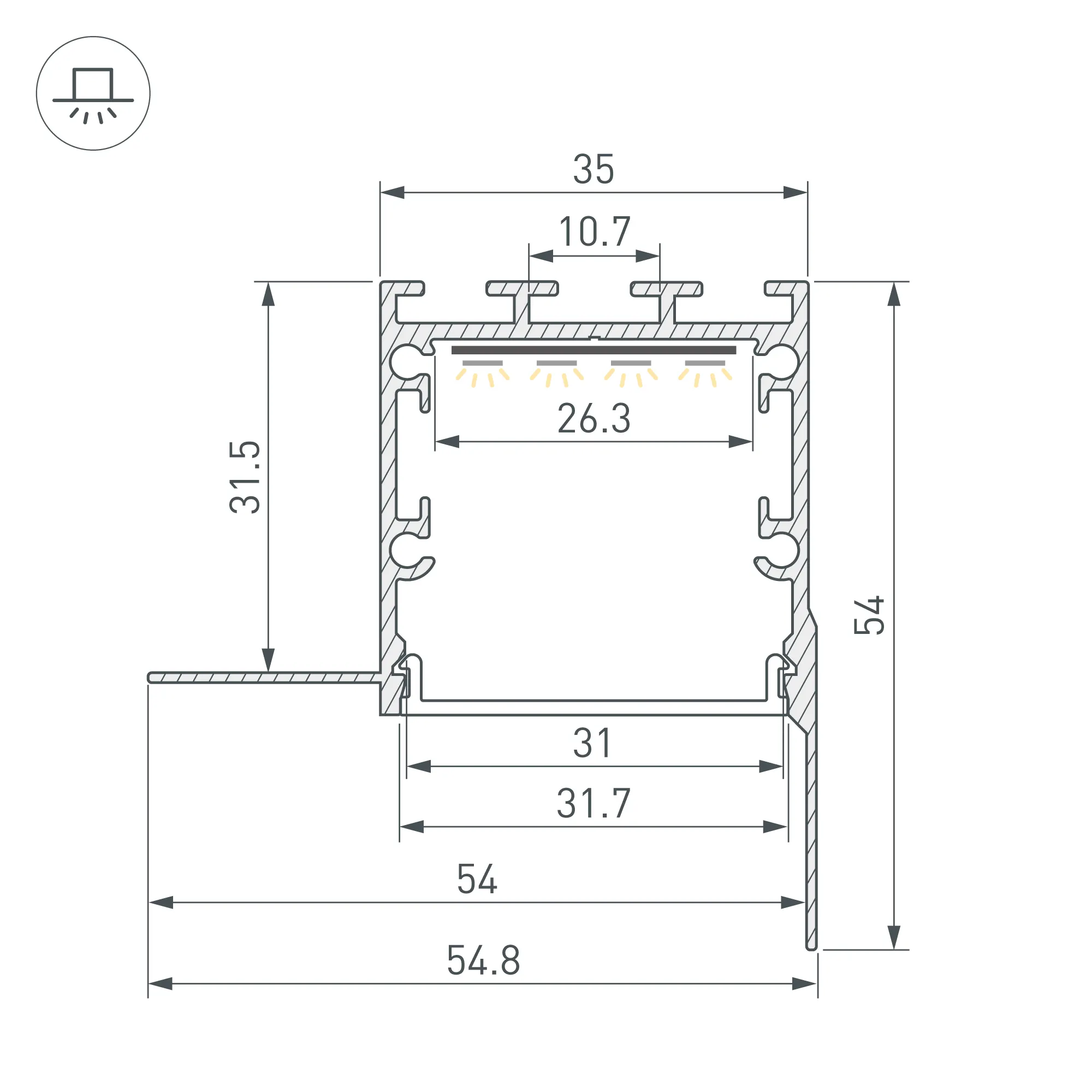 Алюминиевый анодированный профиль для светодиодных лент и линеек. Габаритные размеры (L×W×H): 2000x54,8x54 мм. Паз для установки 35х35 мм. Ширина площадки для ленты 26,3 мм. Экраны, заглушки и другие аксессуары приобретаются отдельно. Цена за 1 метр.
